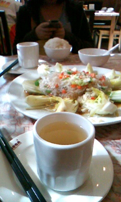 随便收拾了一下行装就出发了。酒店楼下还有提供免费的公交地图。跑到马路上一看,发现北京不像广州随便都能找到吃的,整条路上真的可以一家餐馆都没有。好不容易找到了一家餐厅,两个人就迫不及待进去填饱肚子了。点了一个娃娃菜和一条鱼,其实就是普通家常菜而已。不过这里的茶叶都是大麦茶,很好喝♪